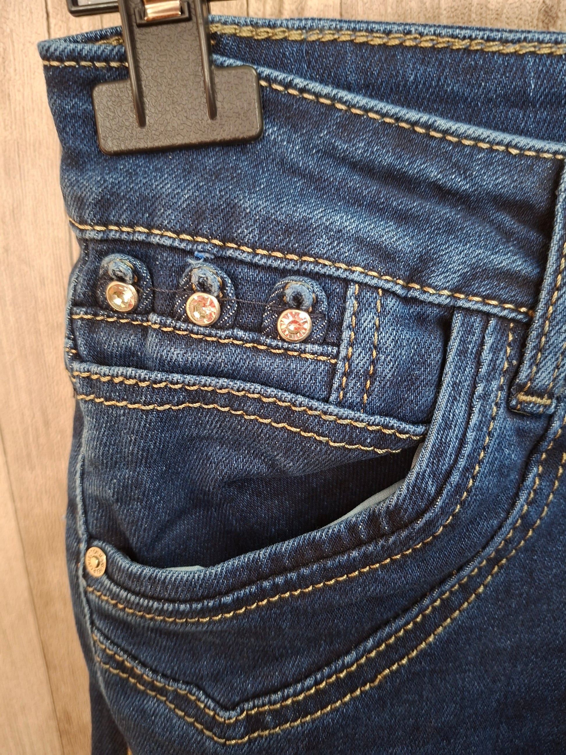 Jean bleu brut boutons bijoux avec déco diamants poche droite